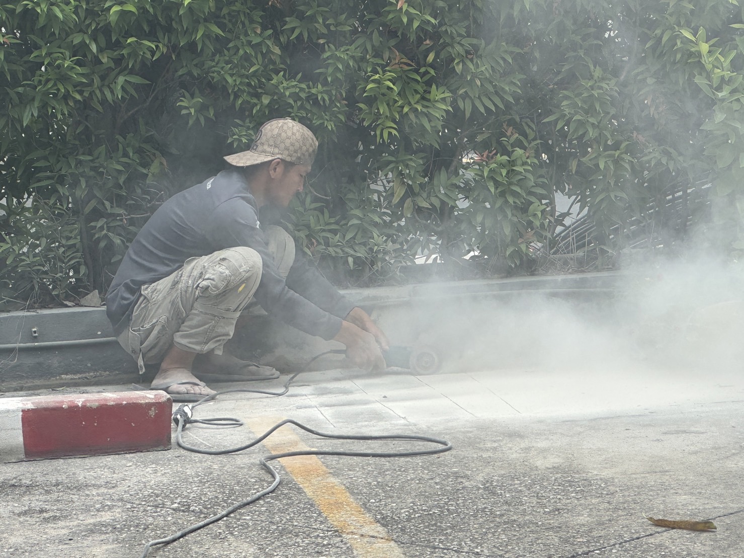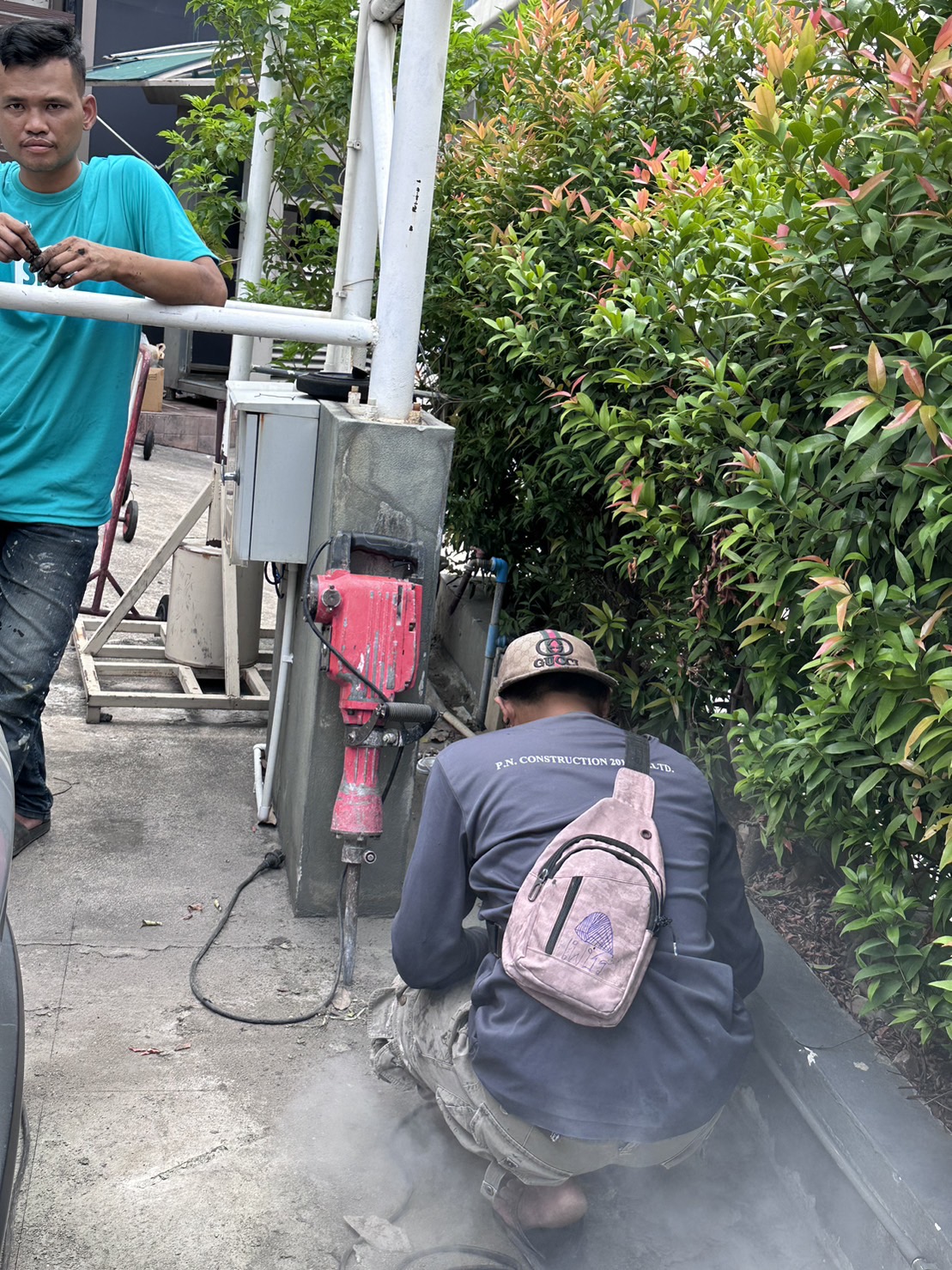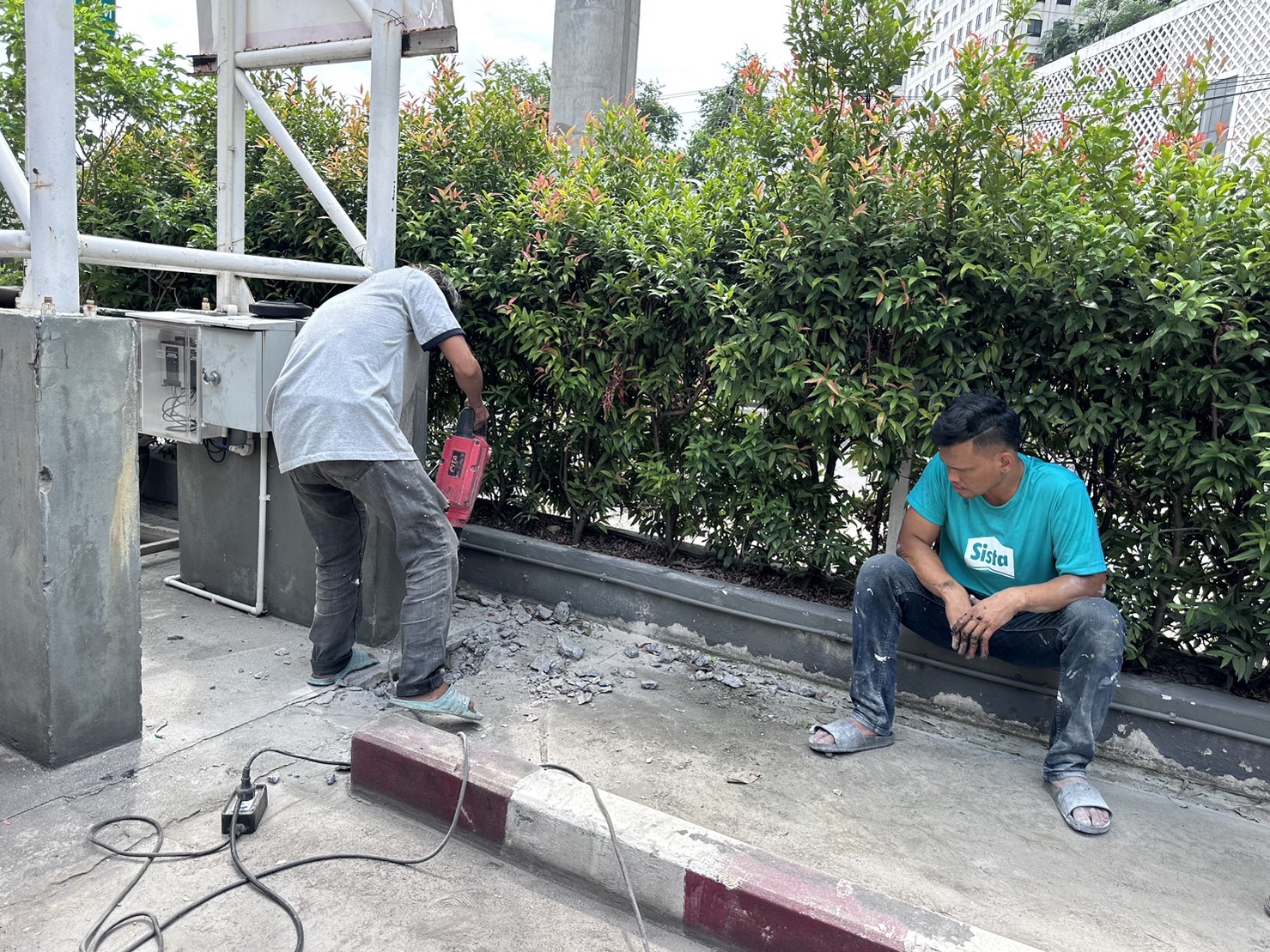 งานขุดเจาะเตรียมทำฐานรากฟุตติ้ง งานสร้างโครงหลังคาลานจอดรถ