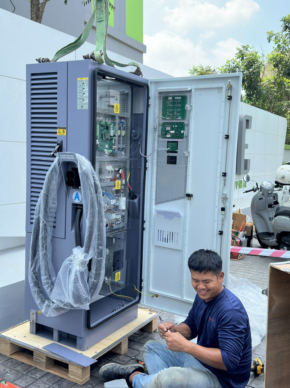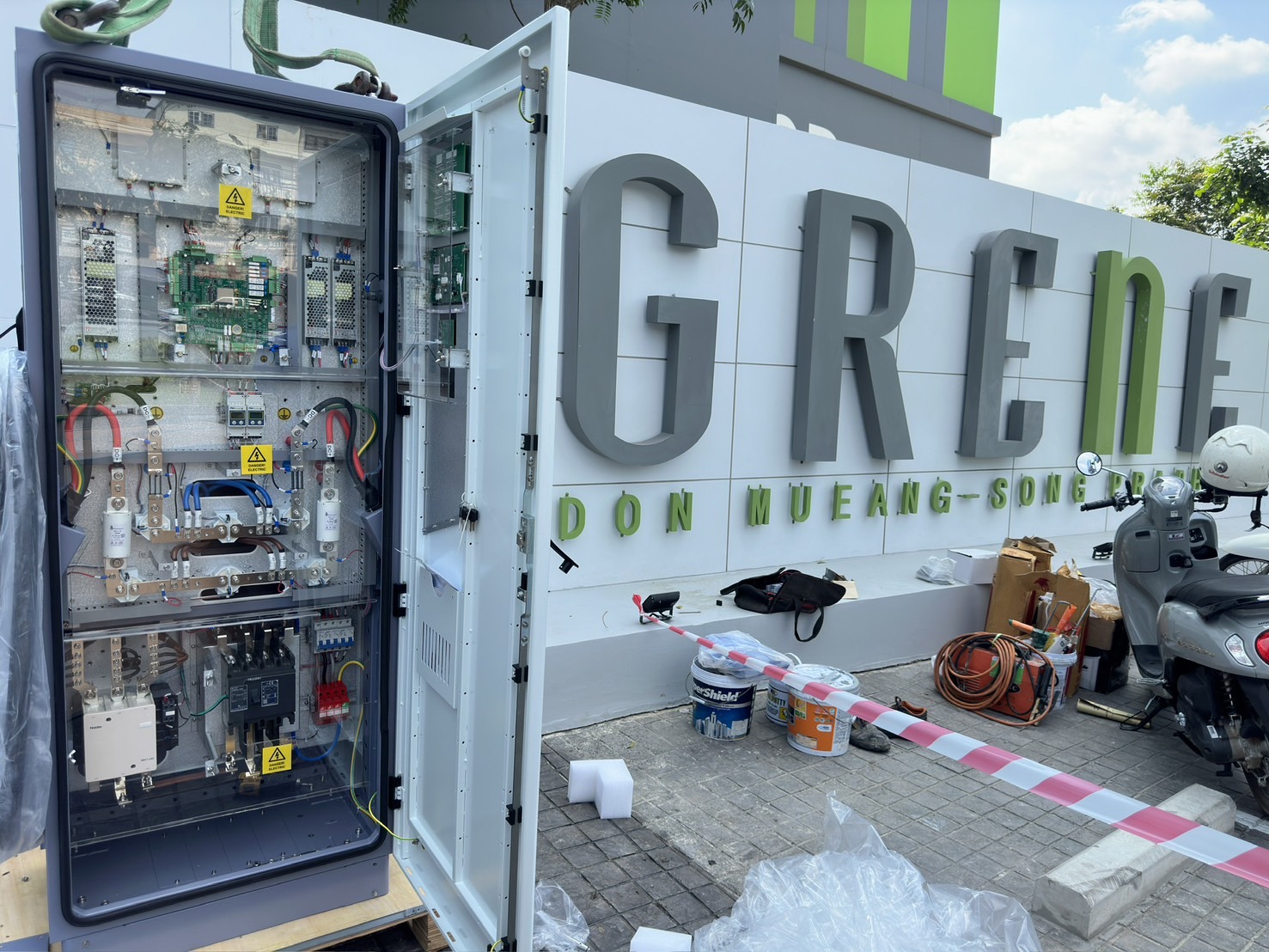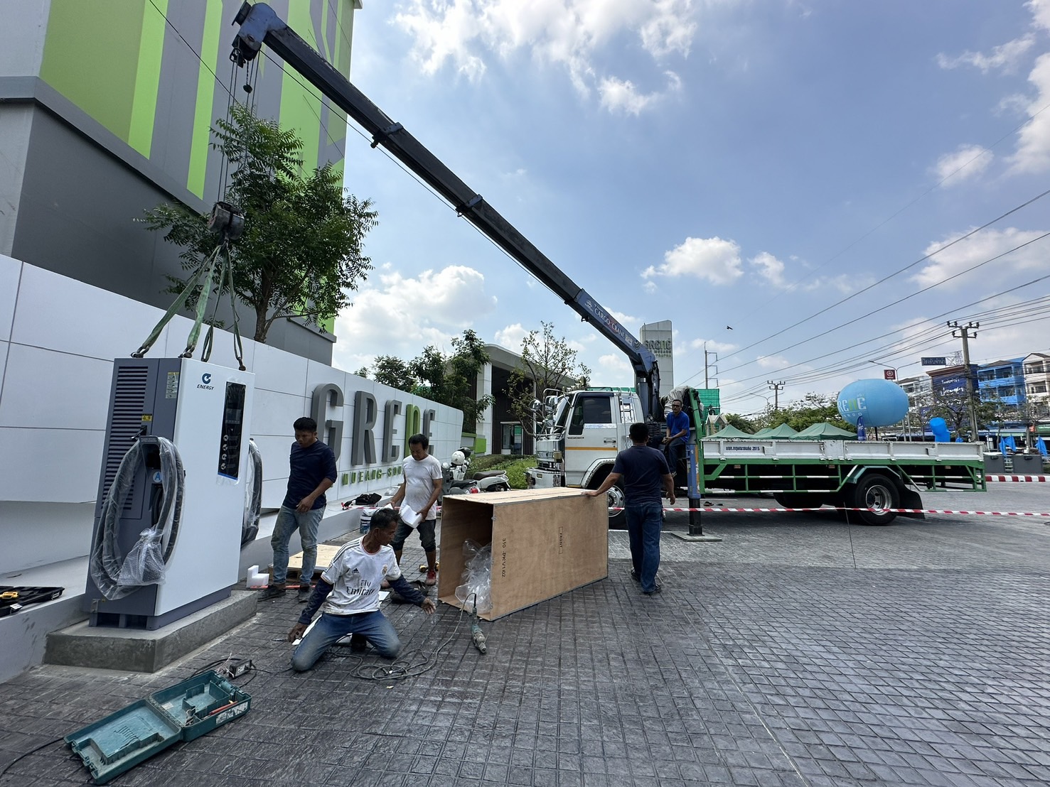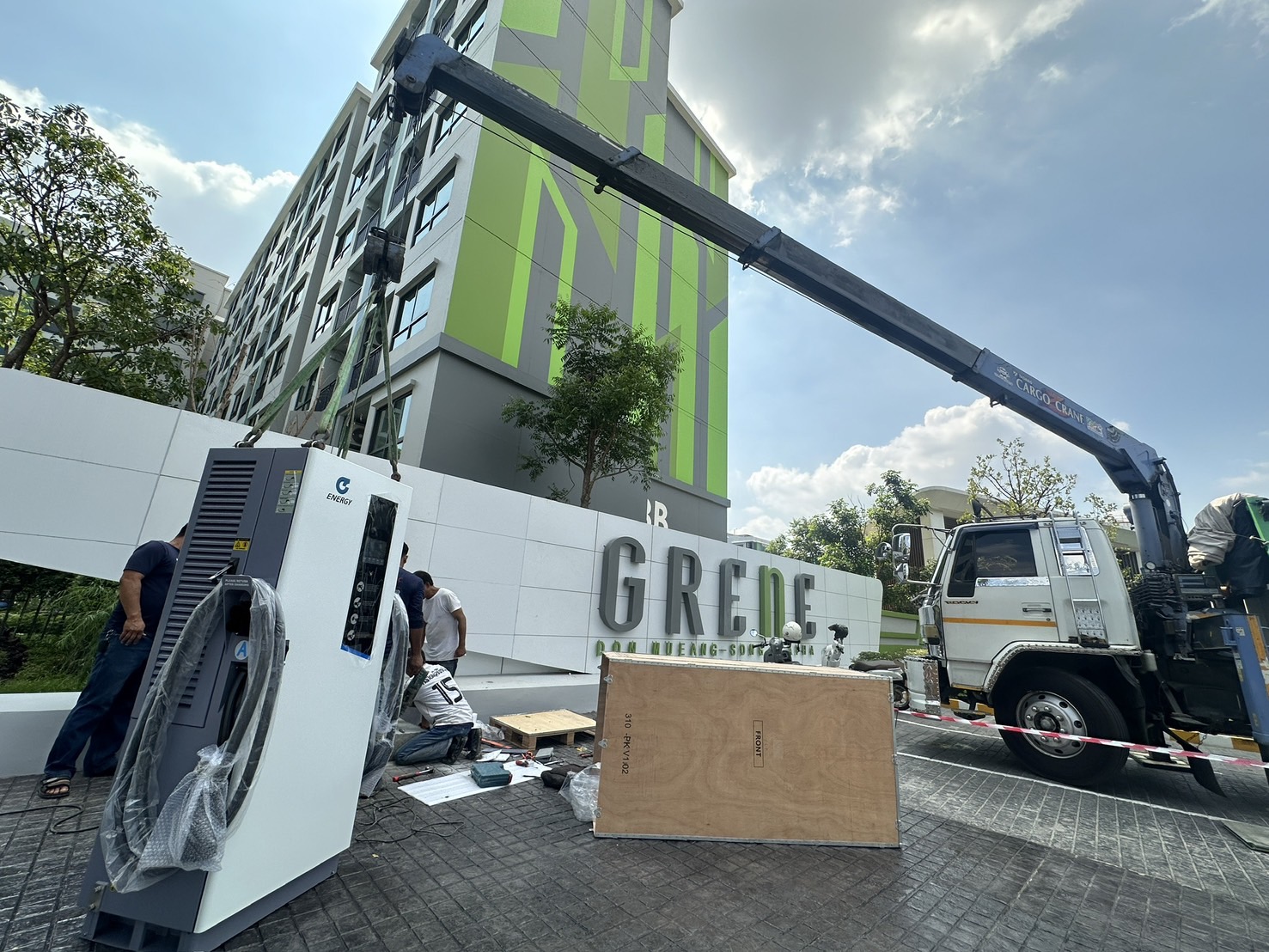 @threewichai ผลงานการติดตั้งตู้ชาร์จไฟฟ้า บริเวณด้านหน้า Sale office คอนโด กรีนเน่ #ตรีวิชัยการช่าง ♬ Tiktok Travel - Official Sound Studio